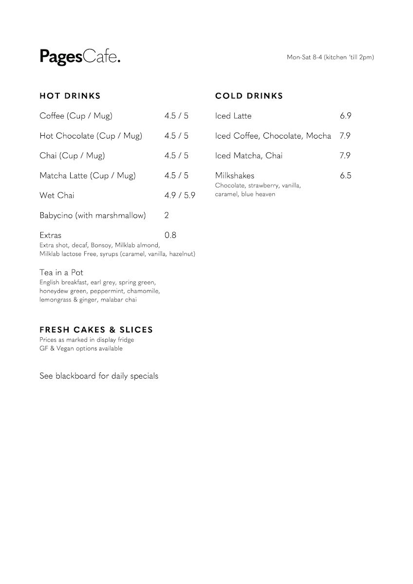 Pages Cafe Blackburn Menu